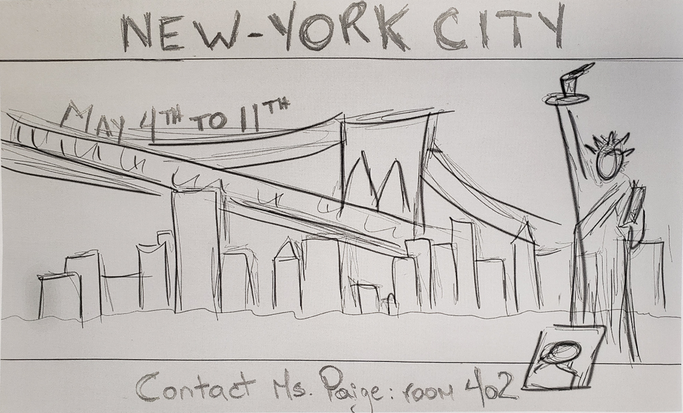 I will place the title TRIP TO NEW YORK CITY at the top with the dates underneath. At the bottom of the poster, I will advise contacting Ms. Paige at her office.