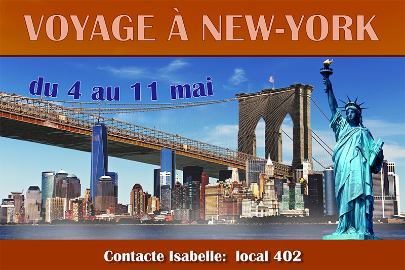 Il me faut donc insérer le texte VOYAGE À NEW YORK en haut complètement, puis la date en dessous. Je vais écrire "Contacte Isabelle: local 402" tout au bas de l'affiche.